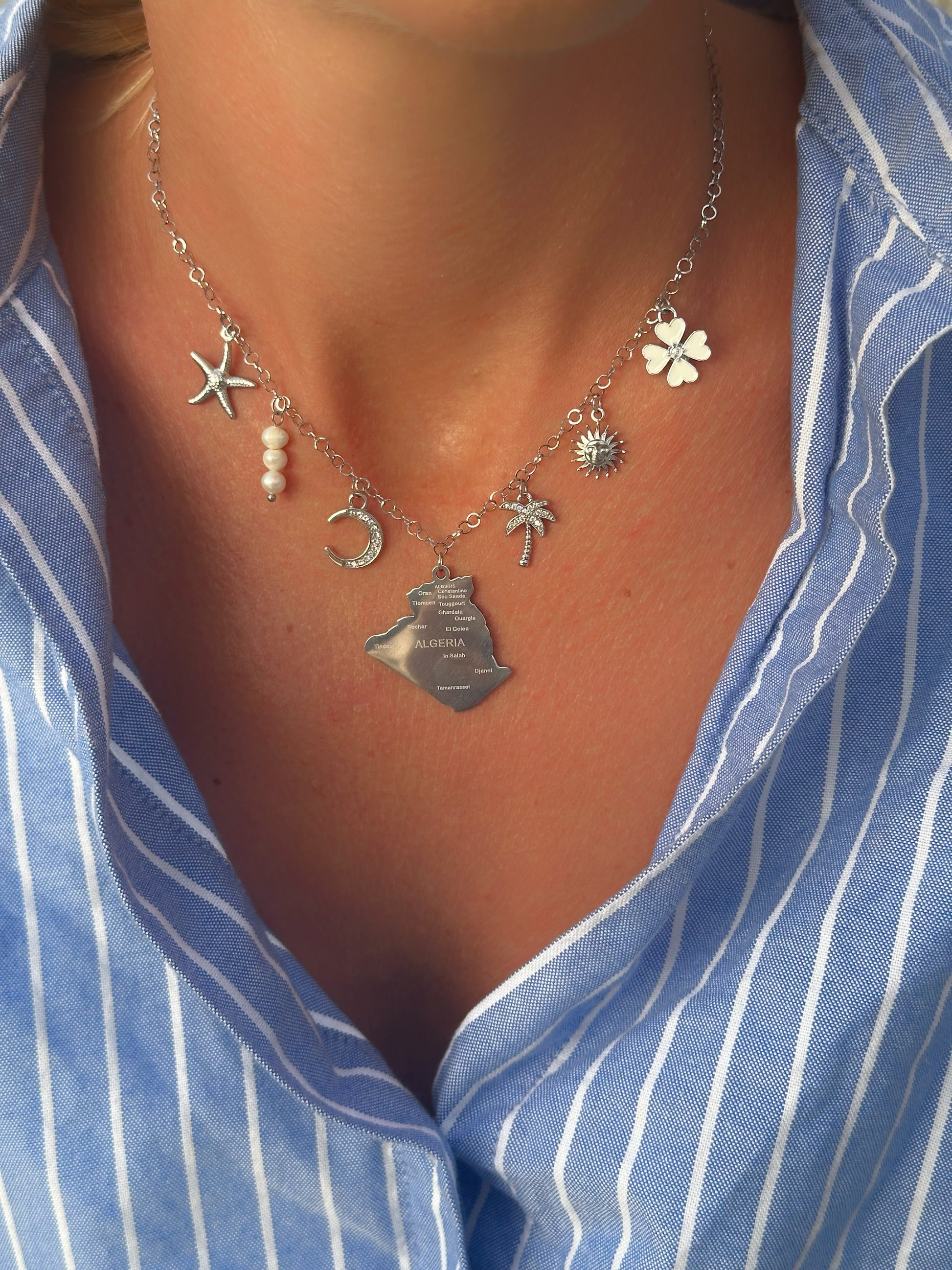 Le collier Algérie allie élégance et identité avec un pendentif délicatement sculpté représentant la carte du pays. Ce bijou sophistiqué est un hommage raffiné à vos racines, parfait pour une touche personnelle et distinguée.