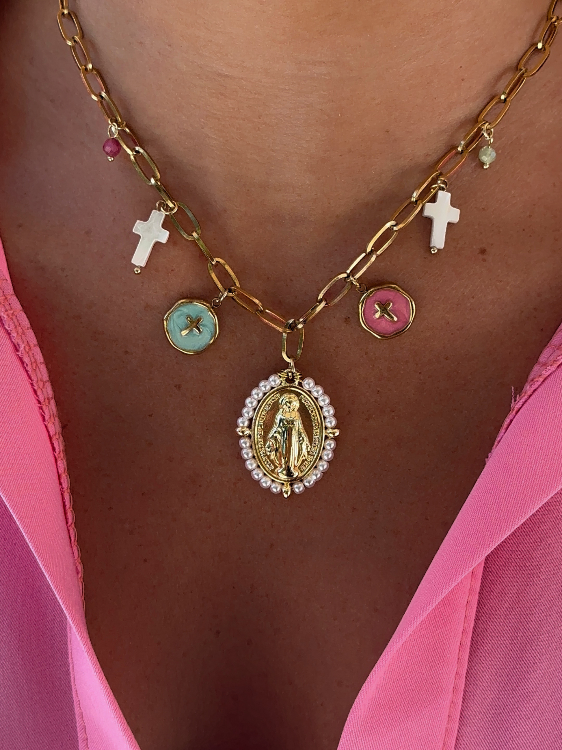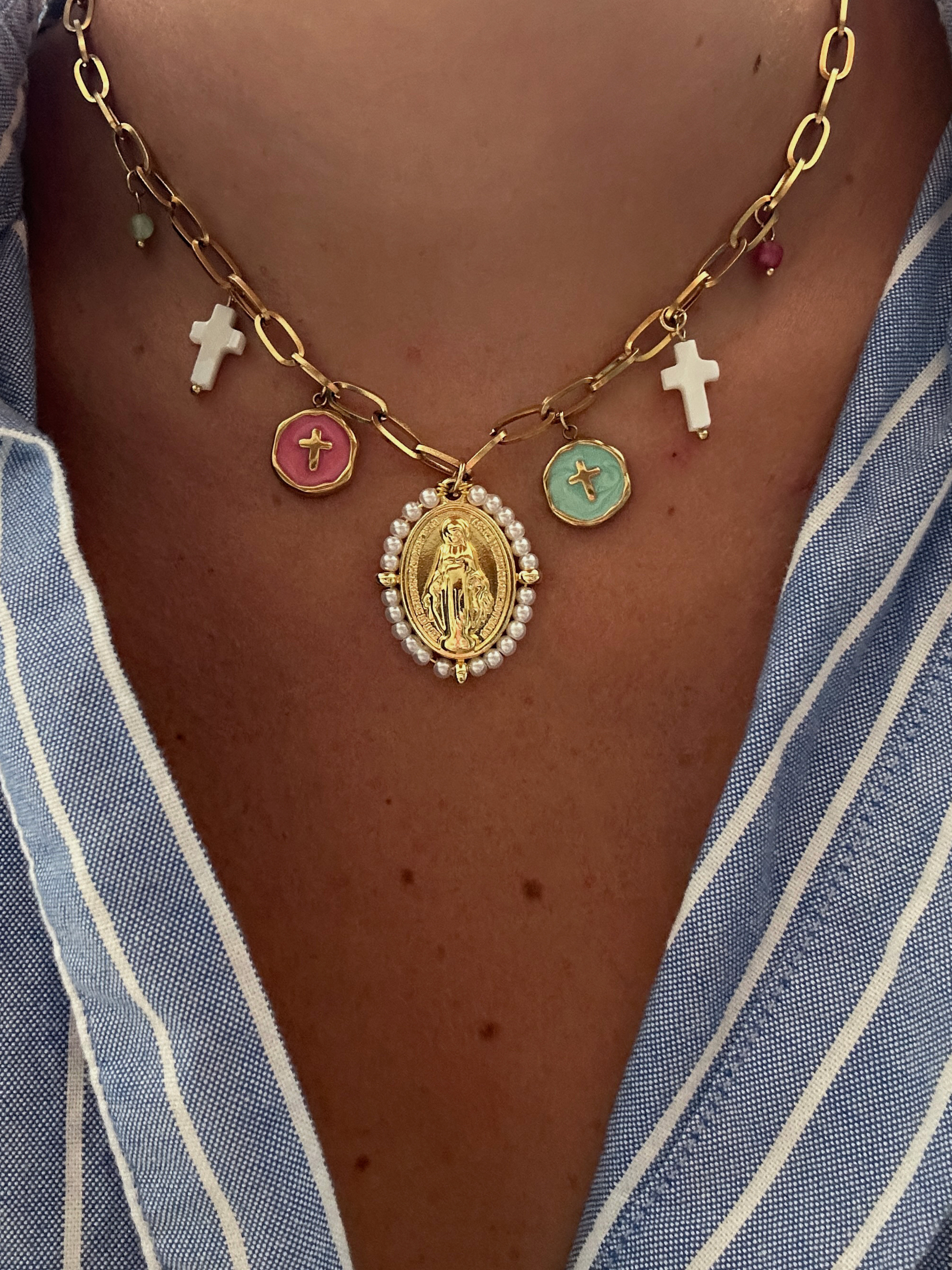 Le collier Lucia, une pièce élégante qui allie beauté et signification profonde. Conçu comme un symbole de croyance, ce bijou délicat vous accompagne au quotidien en apportant une touche de spiritualité et de protection. Son design raffiné s’adapte parfaitement à toutes vos tenues, faisant de Lucia un accessoire incontournable pour exprimer vos valeurs avec style. Offrez-vous ce collier unique et laissez-le illuminer votre chemin.