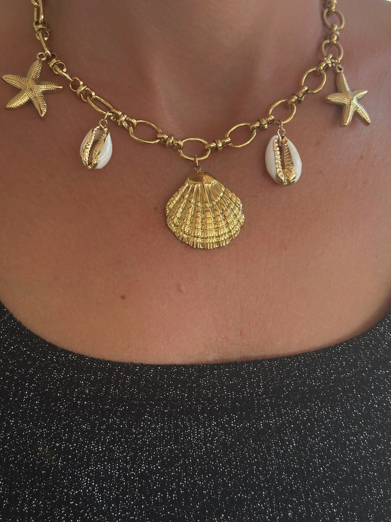 Découvrez Spiaggia, un collier délicat alliant la beauté naturelle des coquillages à l'élégance d'une étoile de mer. Ce bijou sophistiqué évoque la douceur des plages ensoleillées, parfait pour sublimer vos tenues avec une touche marine raffinée.